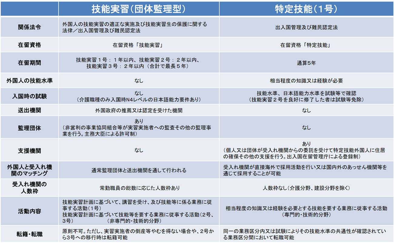技能実習と特定技能の制度比較(概要)