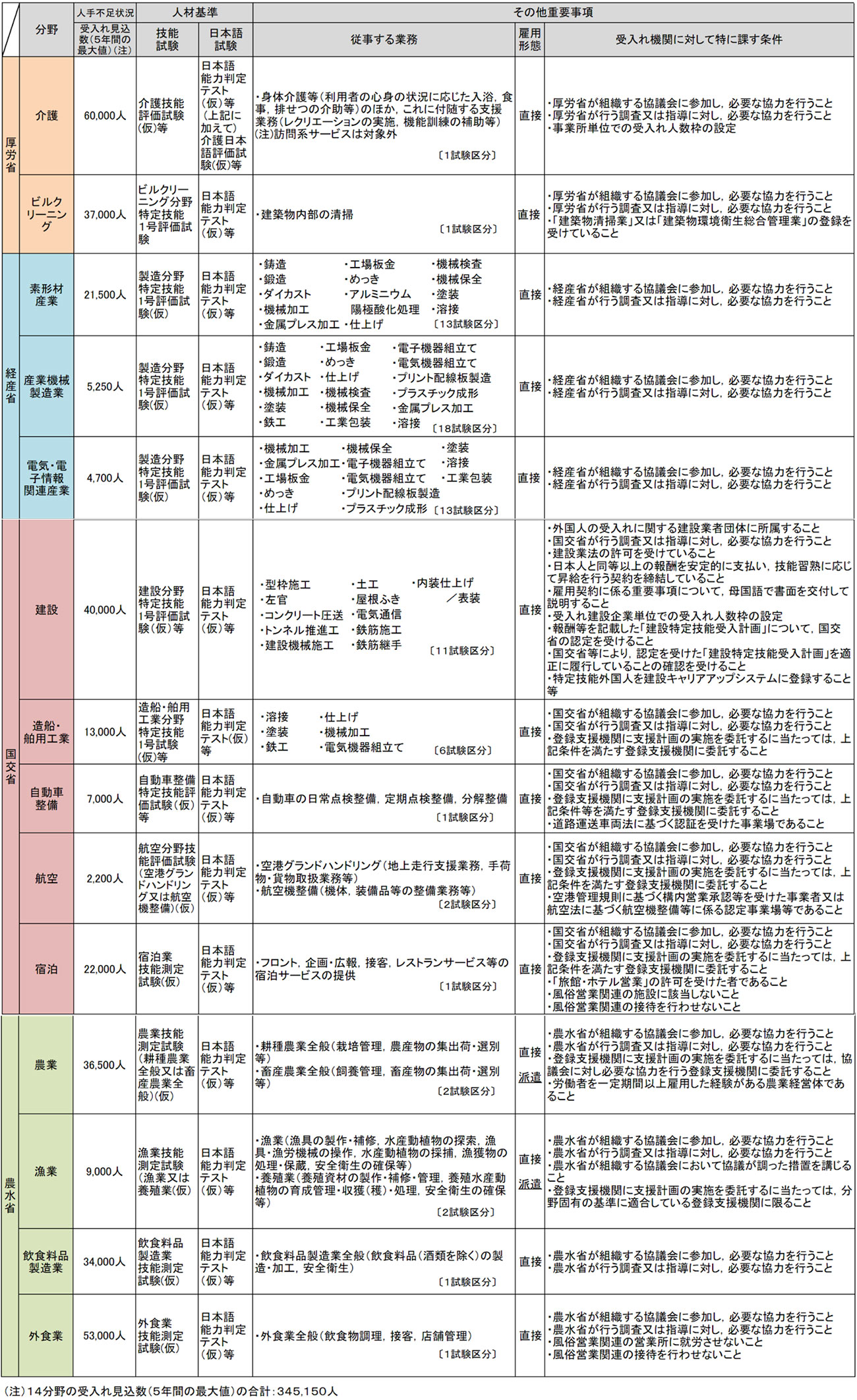 冒頭で触れたように、本改正が目指す最大の目的は、深刻化する人材不足への対策です。そのため、特定技能取得者が就労できる14分野(特定産業分野)は、現在、若手の流入が少なく、深刻な人手不足に悩む業界、つまり介護や建設、製造、農漁業、外食などに定められました。