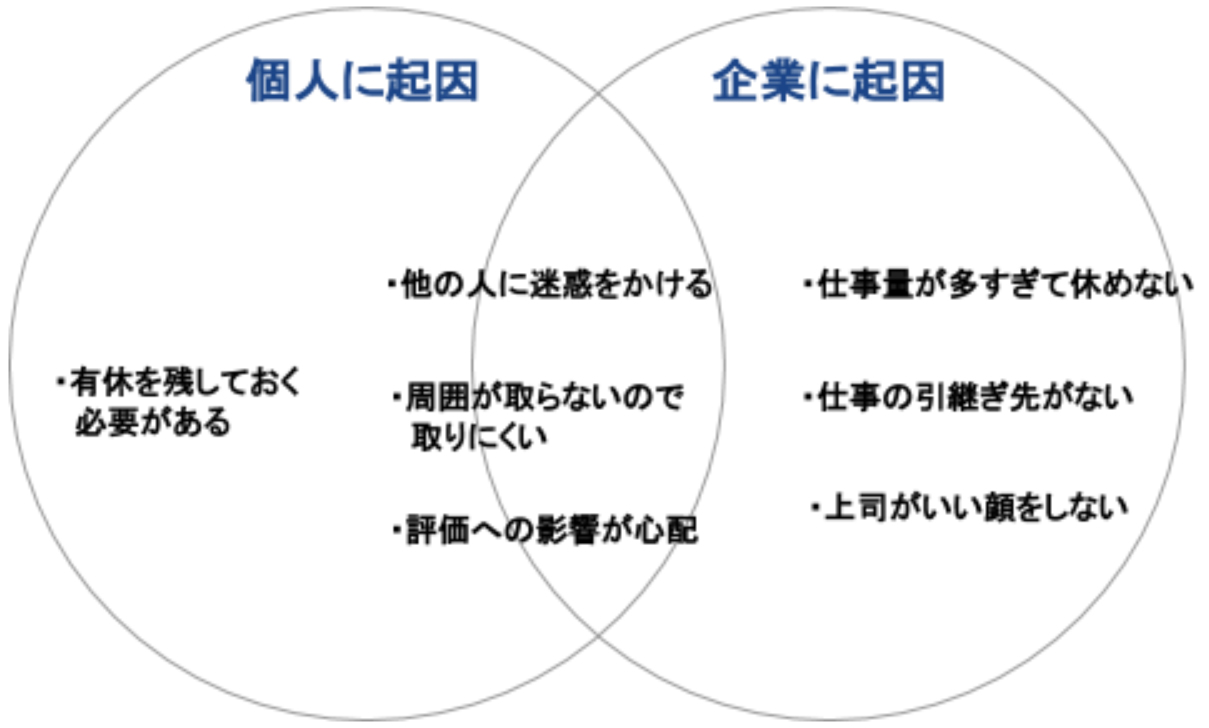 では、これらに対してどんな対策や取り組みを行えば、有給休暇取得率向上につながるのでしょう。上記の取得しない理由を、「個人に起因するもの」「企業に起因するもの」そして「両方に起因するもの」に分けてみました。
