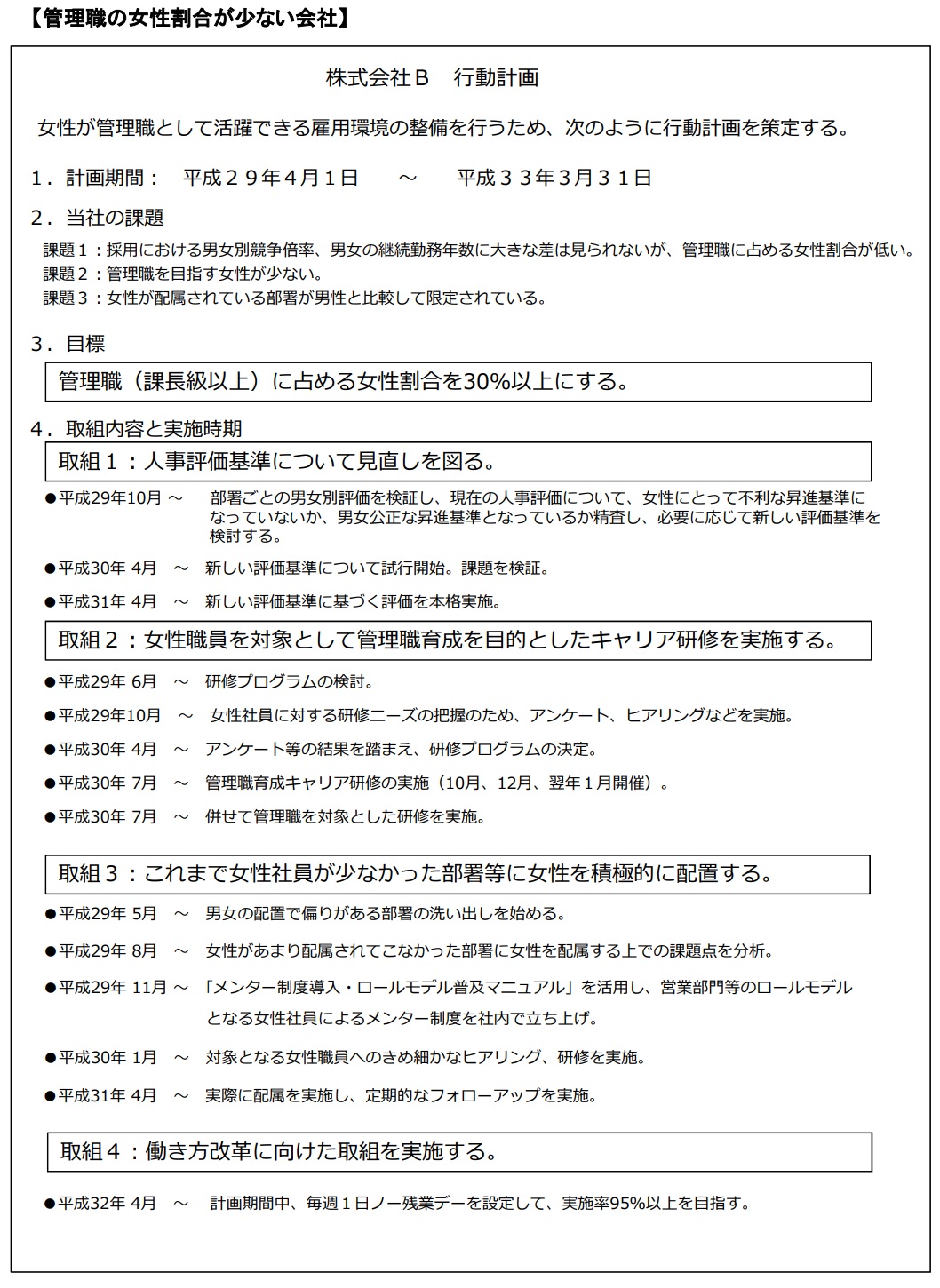たとえば、現状分析を行った結果、管理職の女性割合を高める必要性を感じたのなら、「管理職における女性比率30%以上」を目標に置き、そのためのアクションプランを策定します。以下の例では、「人事評価基準を見直す」「キャリア研修を行う」などが目標達成に向けた取り組み内容です。