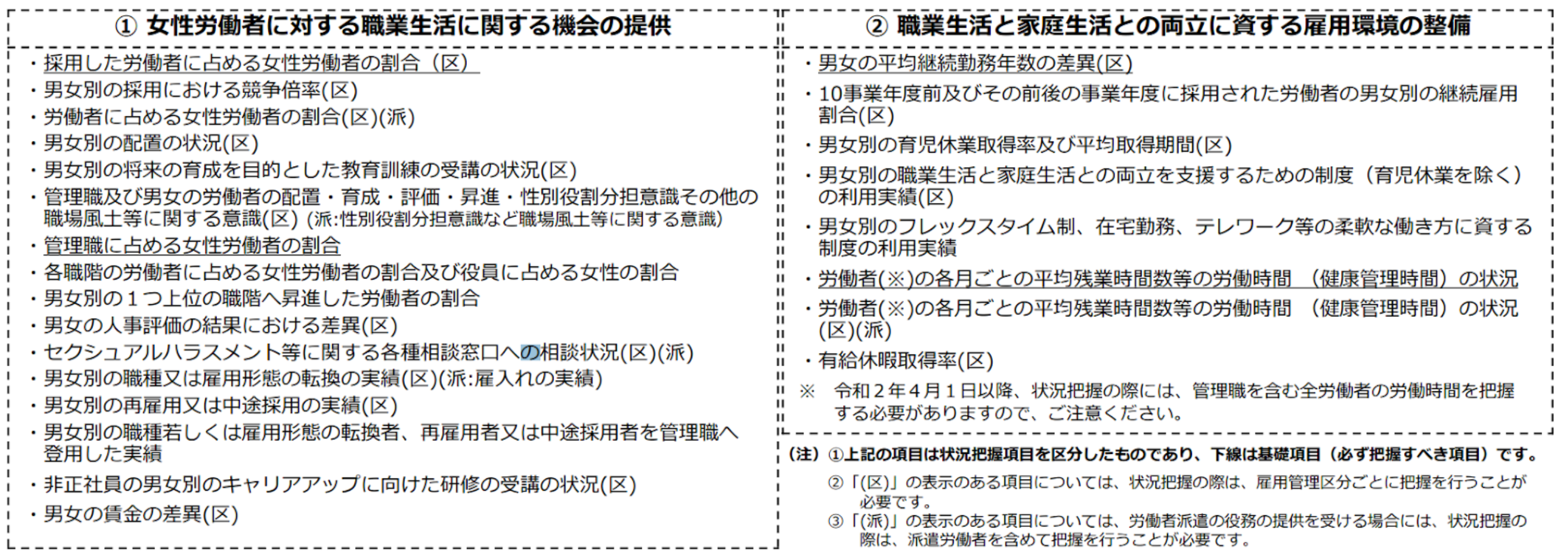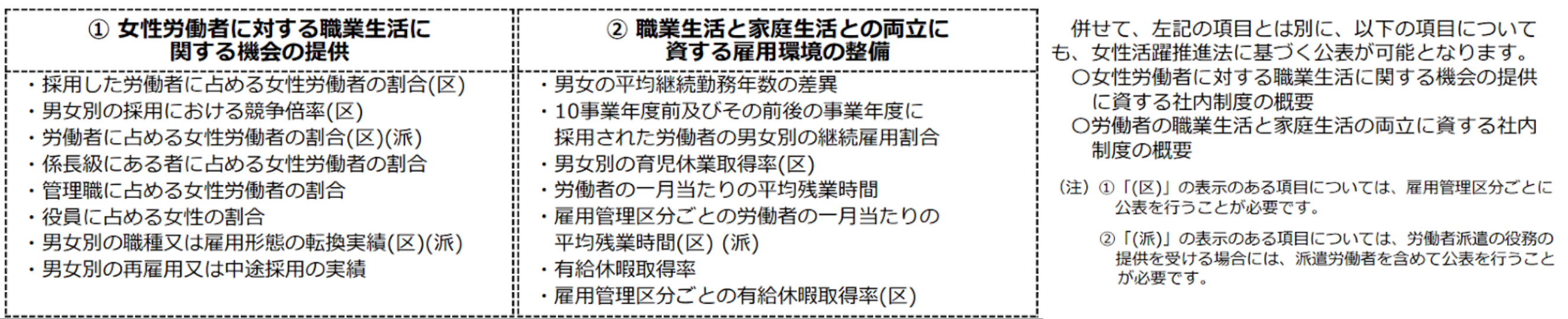 上記の法改正に付随しますが、情報公開についても、「機会提供」と「環境整備」両者のカテゴリーから、それぞれ1項目以上を選択して情報公開することになりました。具体的には、以下のような数値を公表します。