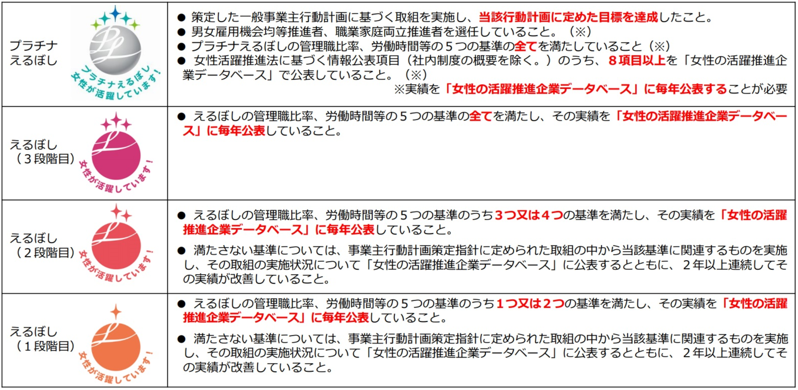 参考:『えるぼし認定、プラチナえるぼし認定』(厚生労働省)