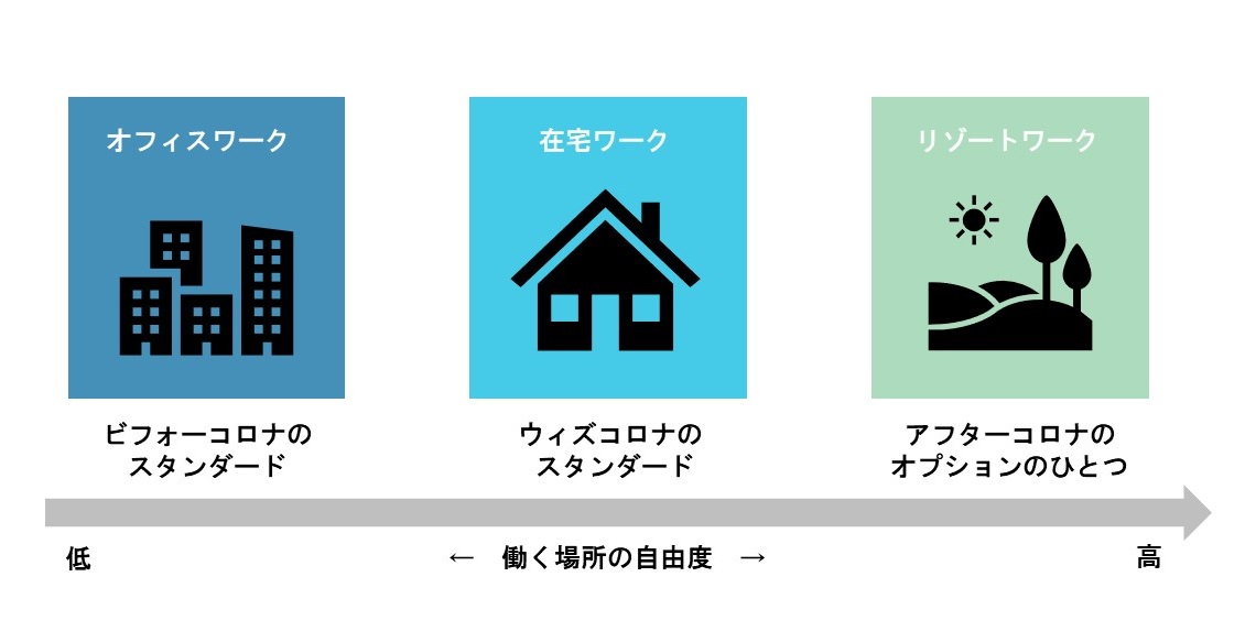 ここでポイントとなるのが、「働く場所」です。ビフォーコロナのスタンダードは、「オフィスや工場、店舗」など、社員が同じ場所に集まって就業するスタイルでした。それが、ウィズコロナ時代の到来とともに、「オフィスに通えない」という制約が生まれたため、「自宅」での就業が一般化しました。これを拡張して、「旅先を仕事場にしてしまおう!」というのが、ワーケーションの考え方です。
