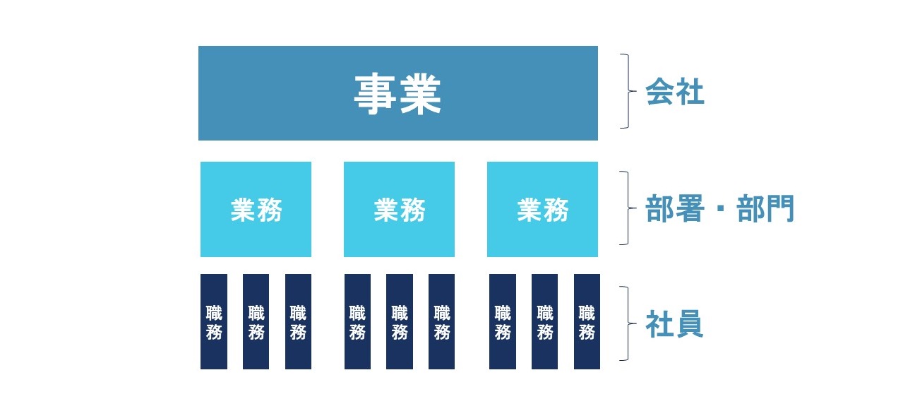 ※社員個人の職務を業務と呼ぶことも多いですが、ここでは上図のように定義します。
