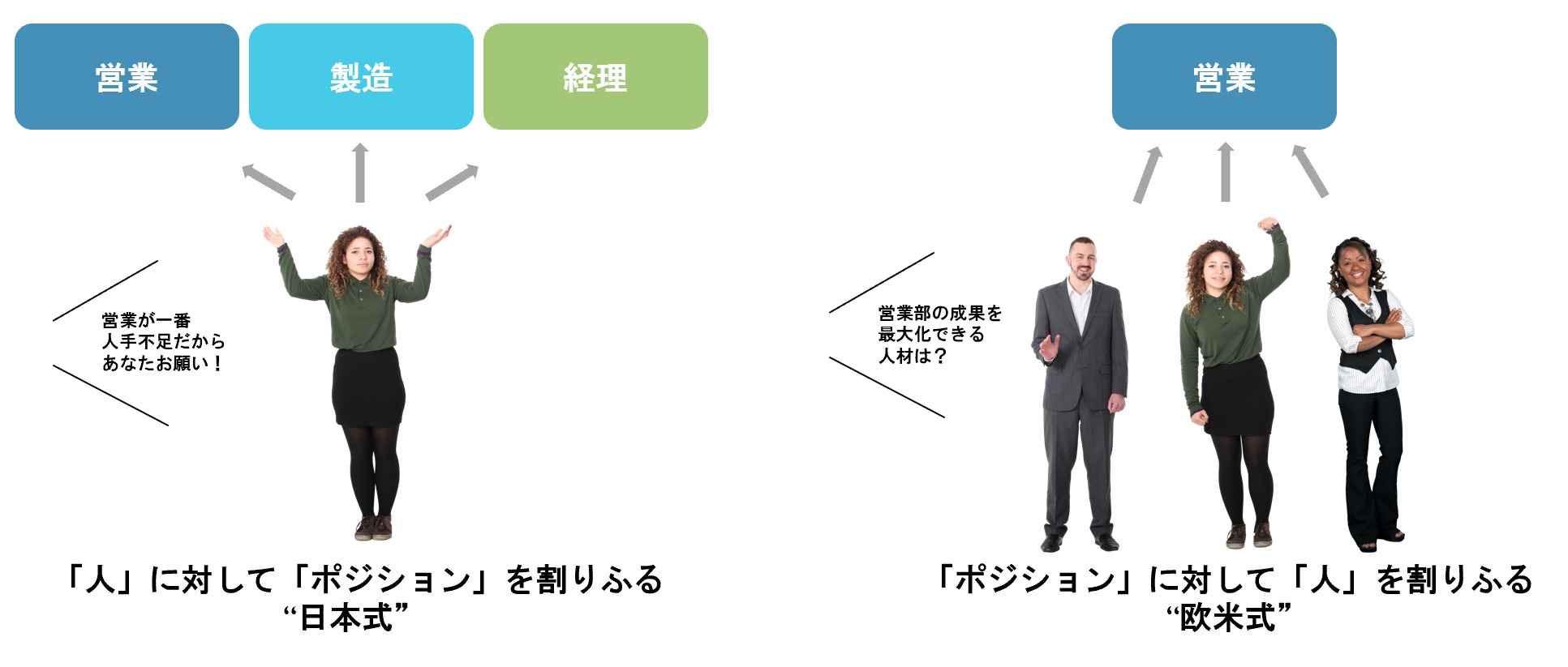 もう一点、日本では解雇規制が厳しいことから、基本的には社内で人材の配置転換を行います。人材が過剰な部署から不足している部署へと、人を異動させて調整をするのです。したがって、必ずしも新しいポジションで力を発揮できる人が、新しい部署に配属になるとも限りません。