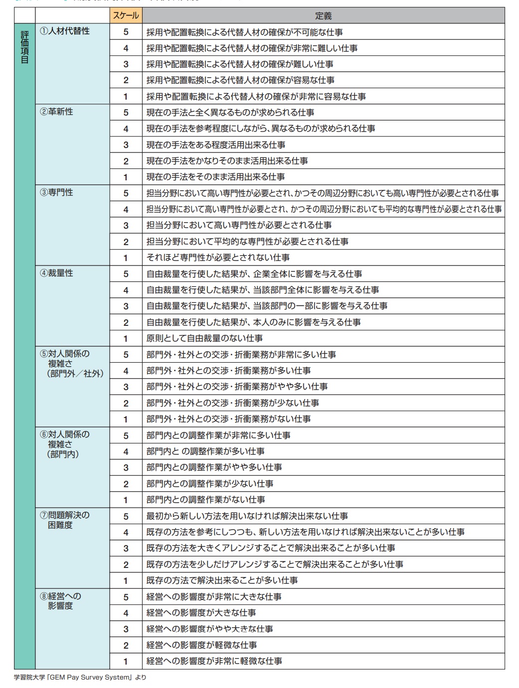 会社によって向き・不向きがありますが、もっとも合理的に判断できそうな手法は、4番目の「要素別点数法」だと思います。職務に含まれる要素を5段階程度で点数化し、格づけていく方法です。「要素」に何を置くかが肝ですが、厚生労働省の出している資料では、以下の8つの要素が用いられています。