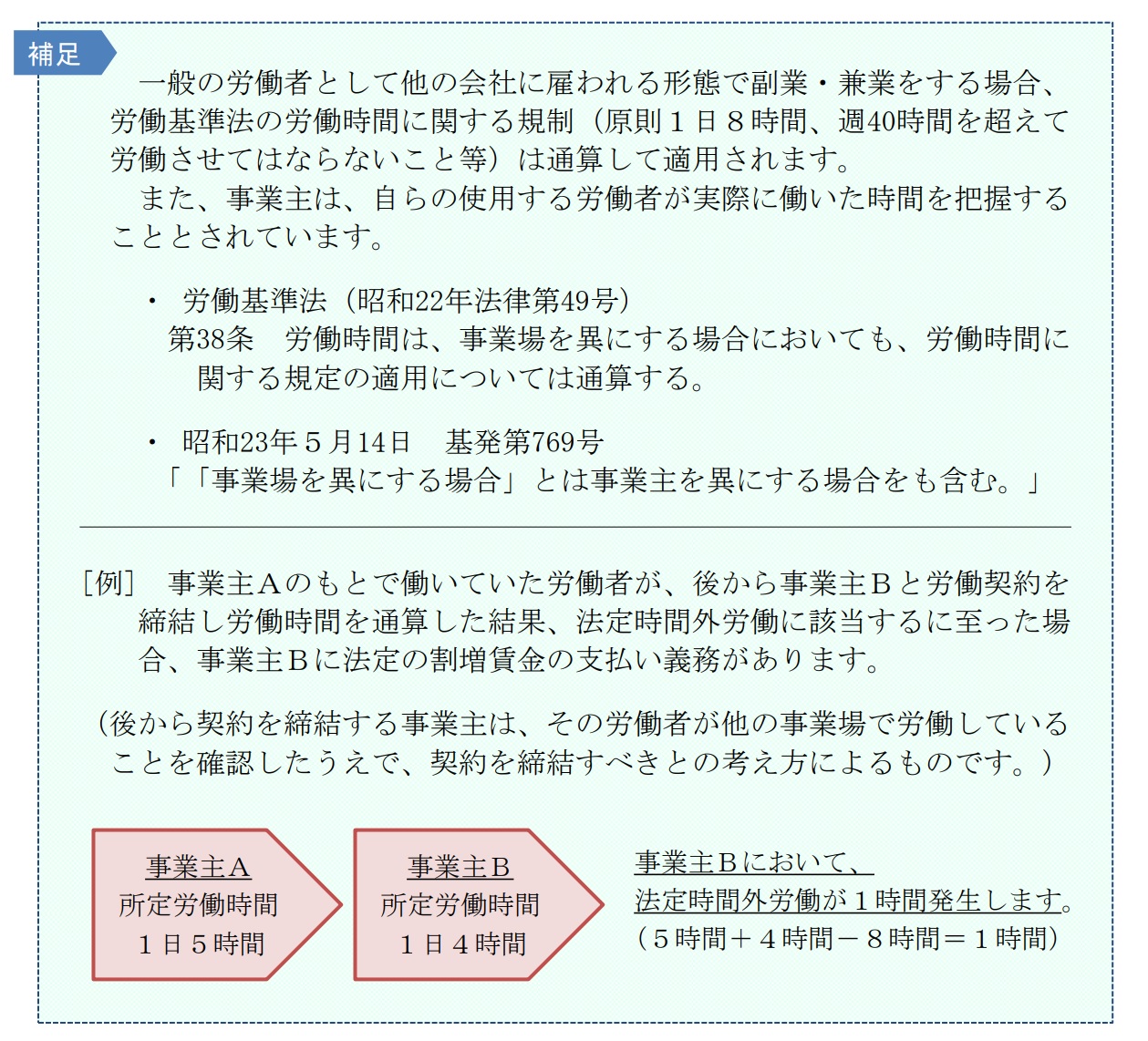 「労働時間は、事業場を異にする場合においても、労働時間に関する規定の適用については通算する。」