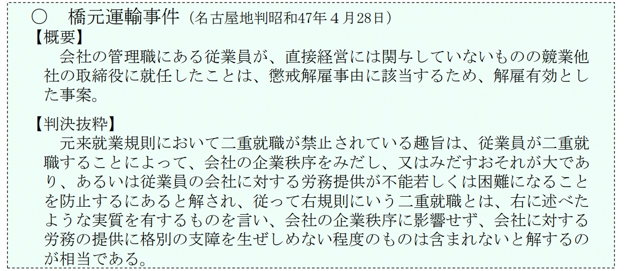 一方で、以下の例では競業他社の取締役に就任したことで企業秩序を乱したとし、解雇が有効とされました。