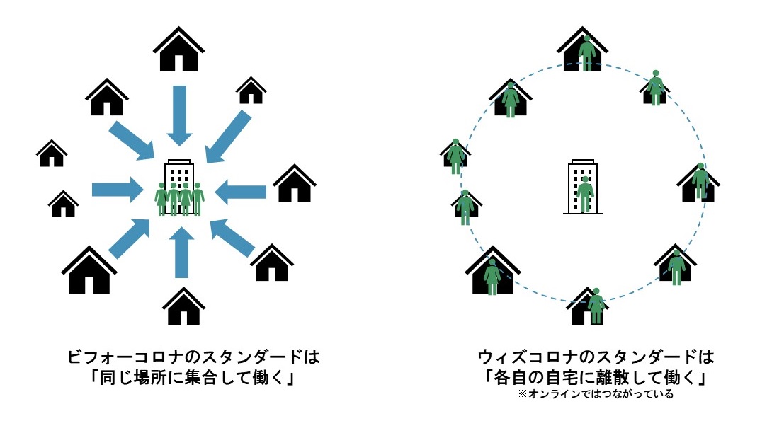 これまで私たちは、同じ場所に集合して仕事に取り組んできましたが、新型コロナウイルスによって「密集すべきではない」という制限が加わったことで、各自の自宅などで離散して働くことになりました。ここで考えられる大きな変化は、(1)チームメンバーとの物理的な距離が遠くなったこと、(2)仕事場として最適化された職場ではなく、生活の場である自宅での仕事を余儀なくされたこと、(3)通勤という移動がなくなったことです。他にもあろうかと思いますが、大きくはこの3つではないでしょうか。