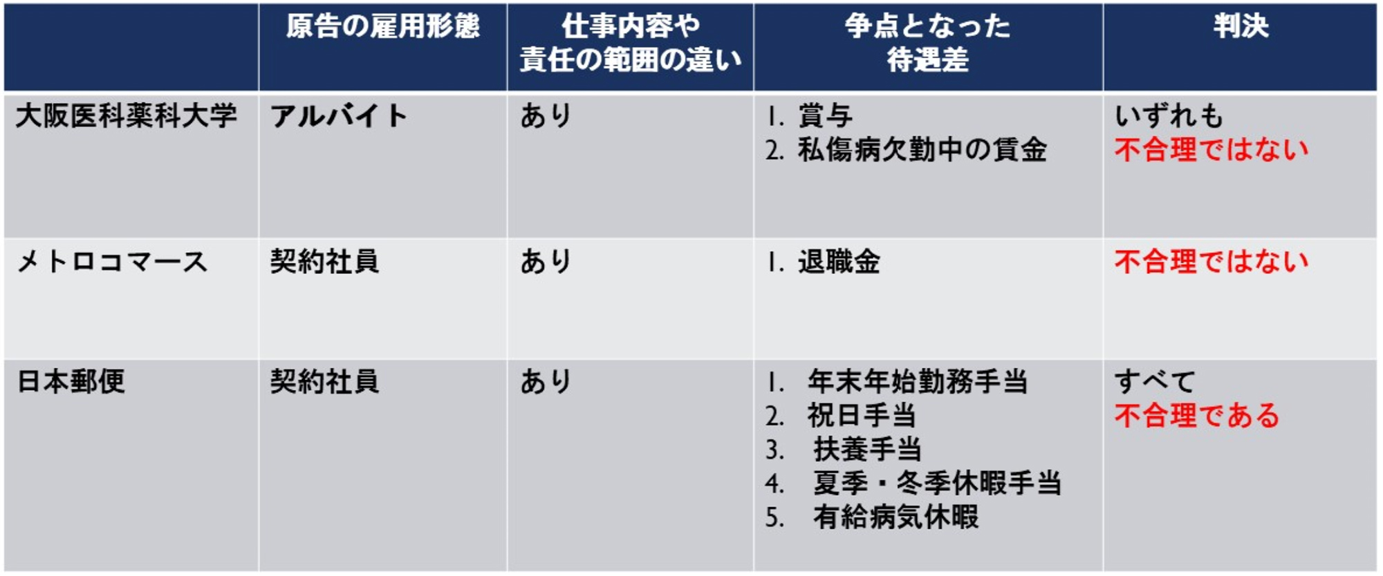 最高裁で争点となったのは、正社員のみに支払われていた「年末年始勤務手当」「扶養手当」「夏季・冬季休暇手当」「有給病気休暇」「祝日手当」の5つの手当です。