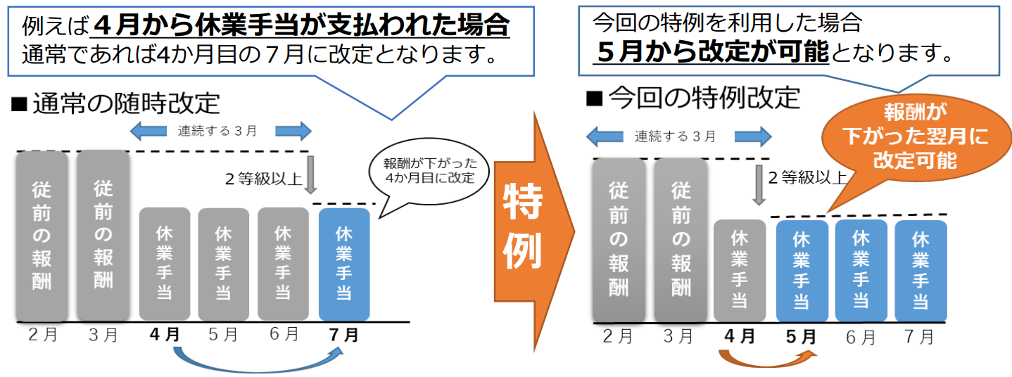 しかし、6月から通常勤務に回復したら、随時改定は行われず、保険料は高いまま徴収されることになりますが、4月の休業による報酬の変動の時に随時改定の特例の手続きをすぐに行えば、翌月5月から標準報酬の随時改定が行われ、保険料も減額されます。