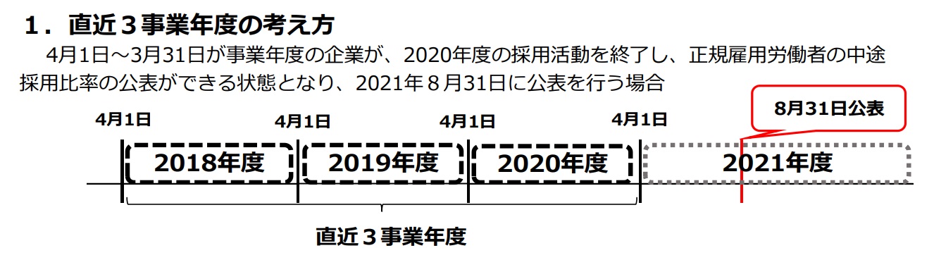 かつ、直近3年分を公表するよう義務づけられました。2021年4月施行なので、遡って「2018年度分」「2019年度分」「2020年度分」の3事業年度分を公表します。公表のタイミングは、前年度の採用活動が終了し数値が固まってからでOKです。