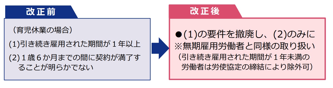 本件は既存ルールの一部見直しとなります。有期雇用とは、契約社員やパートタイマー、アルバイトなどを指します。従来、有期雇用者が育休を取得するためには、「(A)1年以上継続して雇用された実績があること」「(B)1年6カ月先までの間に契約が満了しないこと」の2つの条件を満たす必要がありました。これに関して、(A)の勤務実績の条件は廃止し、(B)の勤務見込みの条件のみ残すことに変更されました。