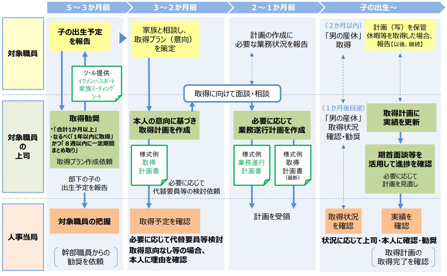 参考までに、民間に先行して男性育休取得の促進に取り組む国家公務員のフローを紹介します。内閣官房のHPページによると、おおむね「出産の5~3ヶ月前」に、男女問わず子の出生予定報告を提出することになっているようです。また、「出産の3~2ヶ月前」に育休の取得予定計画を提出し、上司と面談・相談するフローになっています。これをベースに自社用にカスタマイズし、流れを検討しましょう。