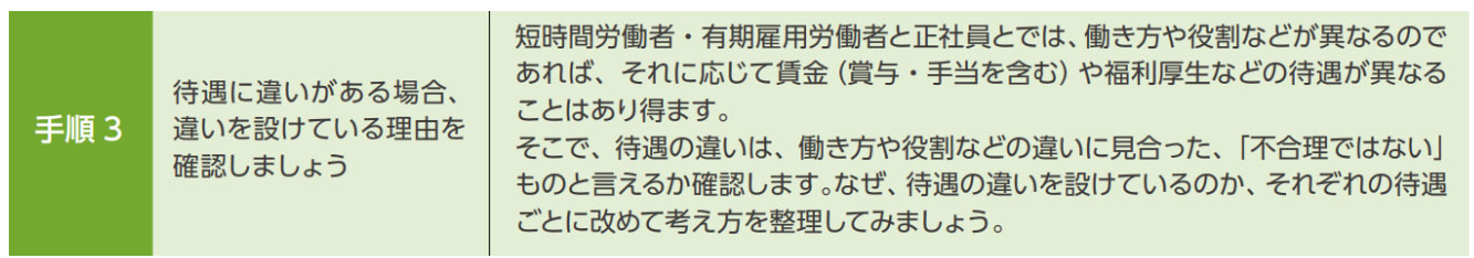 2つ目は、正規雇用と非正規雇用で、賃金や待遇に差をつけているかどうか。基本給、賞与、各種手当、昇給、休日・休暇、教育制度、福利厚生など、あらゆる待遇について確認します。もし、何ひとつとして待遇差はないならば、対応することはありません。