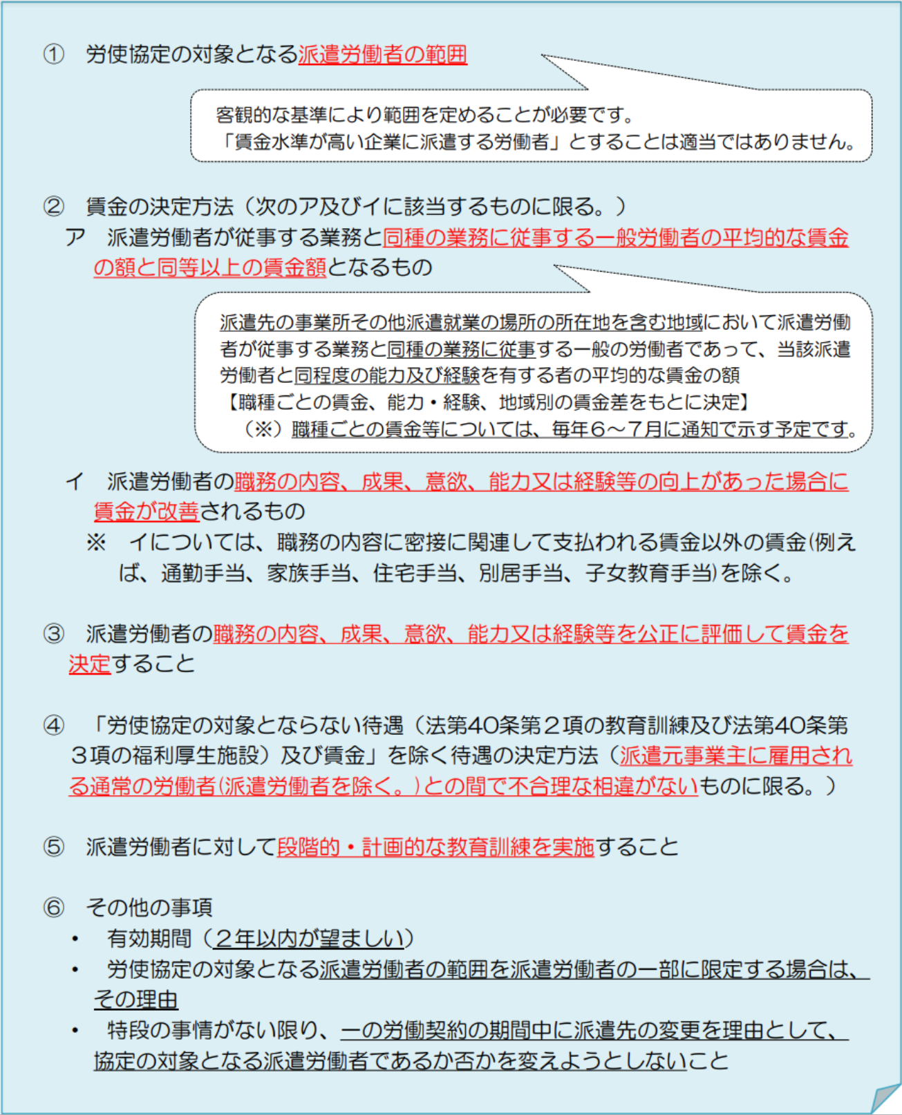 ただし、期間の長短はあれ、派遣期間が終わると、次の派遣先に行くというケースが大半。派遣先が変わるたびに、賃金が上下することが所得の不安定につながるとの懸念もあります。そのため、以下の内容を盛り込んだ労使協定を締結すれば、必ずしも派遣先の待遇に合わせなくてもよいとの着地になりました。