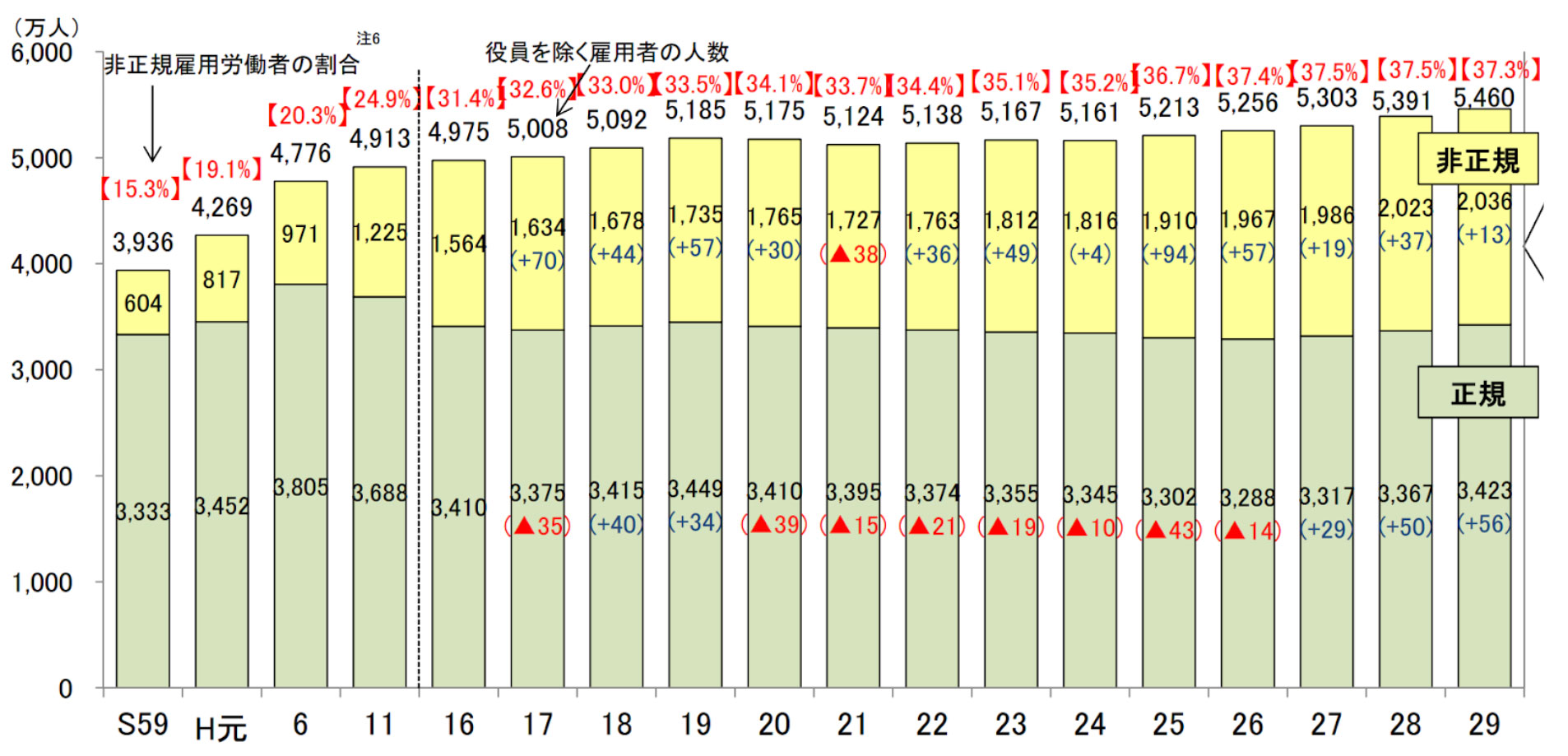 平成29年の労働力調査によると、雇用されて働く人は日本全体で約5460万人。そのうち、正規雇用が約3423万人、非正規雇用が約2036万人にのぼることが明らかにされました。つまり、全体に占める非正規雇用の割合は37.3%。正規雇用者数は横ばいが続いている一方で、非正規雇用者数は、昭和59年と比較して約3倍に伸長しています。
