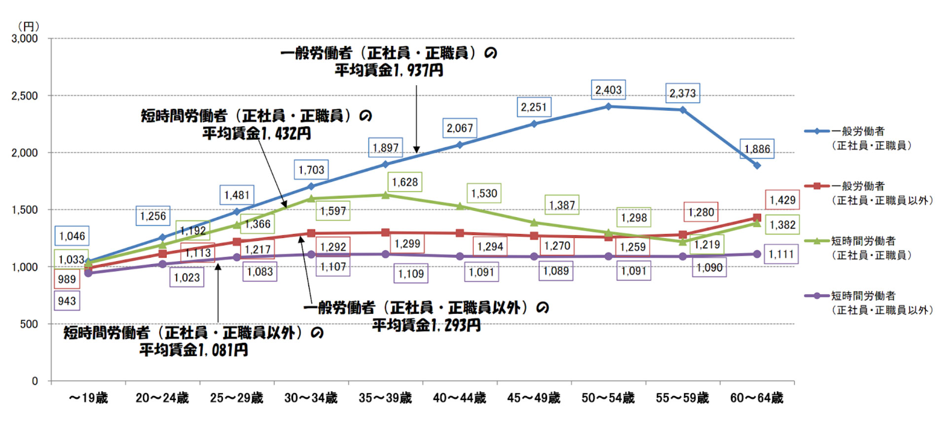 では、今回メスが入ることになった、正規と非正規の待遇差の現状は、どのくらいなのでしょうか。正規の平均賃金は1937円。右肩上がりで伸び、40歳を超えると2000円を上回ります。一方、非正規フルタイムは1200円前後、パートタイム(短時間同労者)は1000円前後で、年齢を経ても大きく伸びることはありません。フルタイム同士で平均を比較した場合、正規は1937円に対し、非正規は1293円。両者には、約1.5倍の賃金差が生まれています。