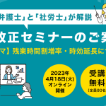 セミナー内容概要 2023年4月より、中小企業には猶予されていた「残業時間60時間を超えた割増率は1.25から1.5へ」というルールが適用されます。これは「働き方改革関連法」の施行によるものです。 働 …