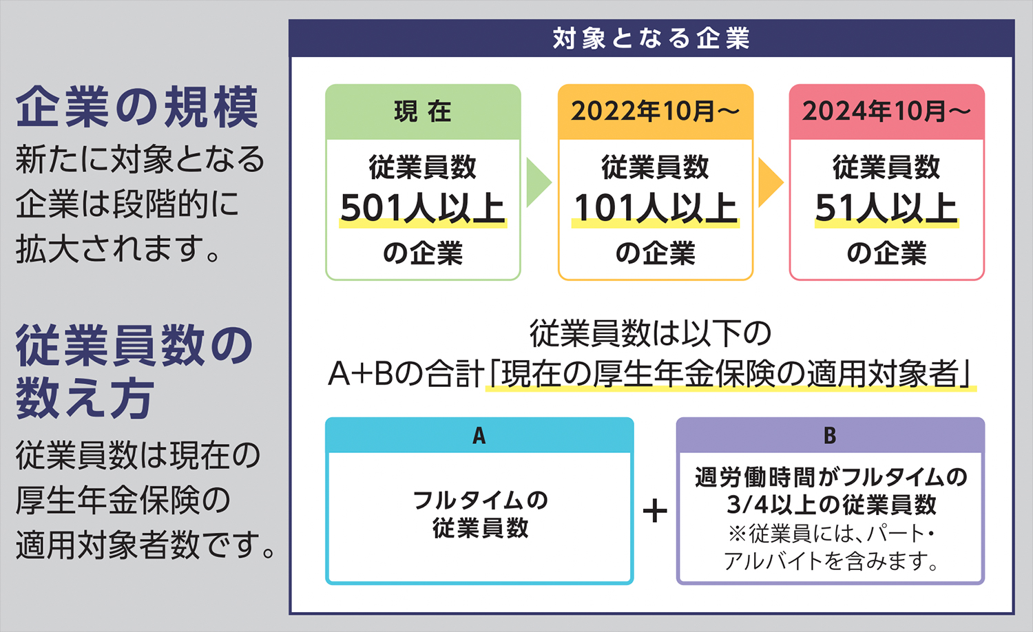 2022年10月時点において、新たに対応が求められるのは、従業員数「101人以上〜500人以下」の企業。ここでいう従業員数とは、「現在の厚生年金保険の適用対象者」を指します。現時点で自社の厚生年金に加入していないパート・アルバイト、あるいは派遣社員、業務委託メンバーなどは含みません。自社で雇用し、かつ厚生年金に加入している従業員の合計数をカウントし、「101人以上/500人以下」なら対象企業となります。(対象企業には、2022年8月までに日本年金機構から通知書類が届けられています)