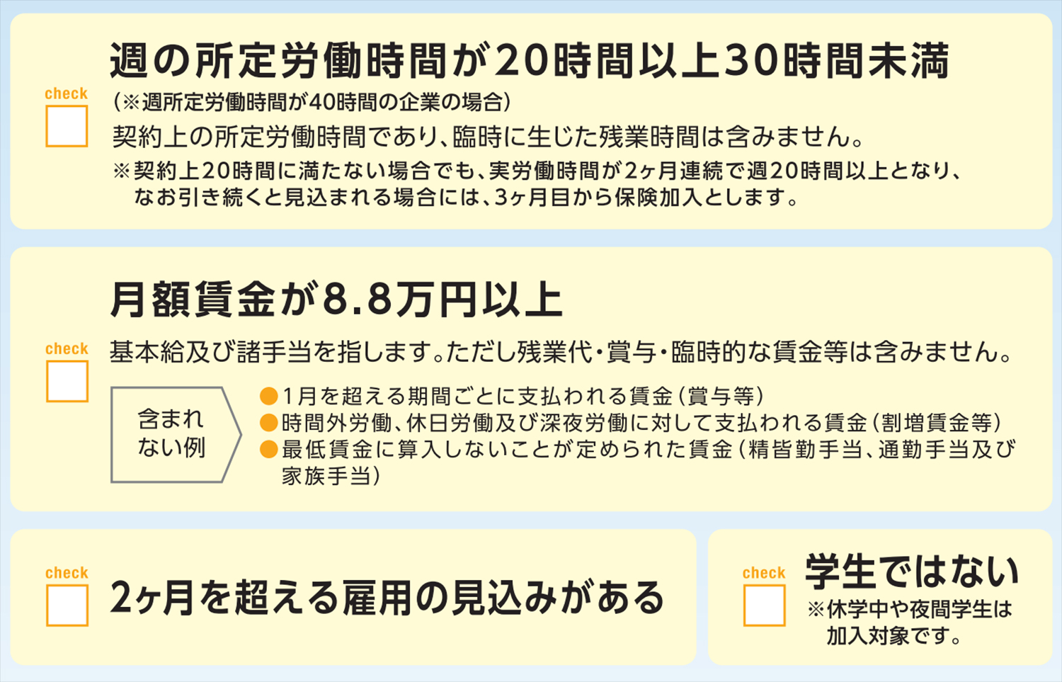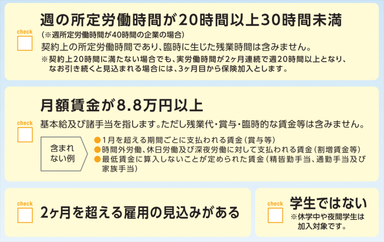 上記の対象企業のうち、新たに社会保険に加入が義務づけられるのは、次の4つの要件をすべて満たす従業員です。