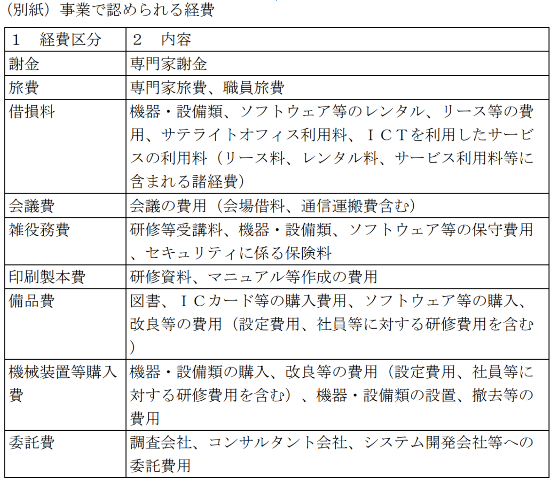 含められる経費について、詳しくは以下の表をご確認ください。