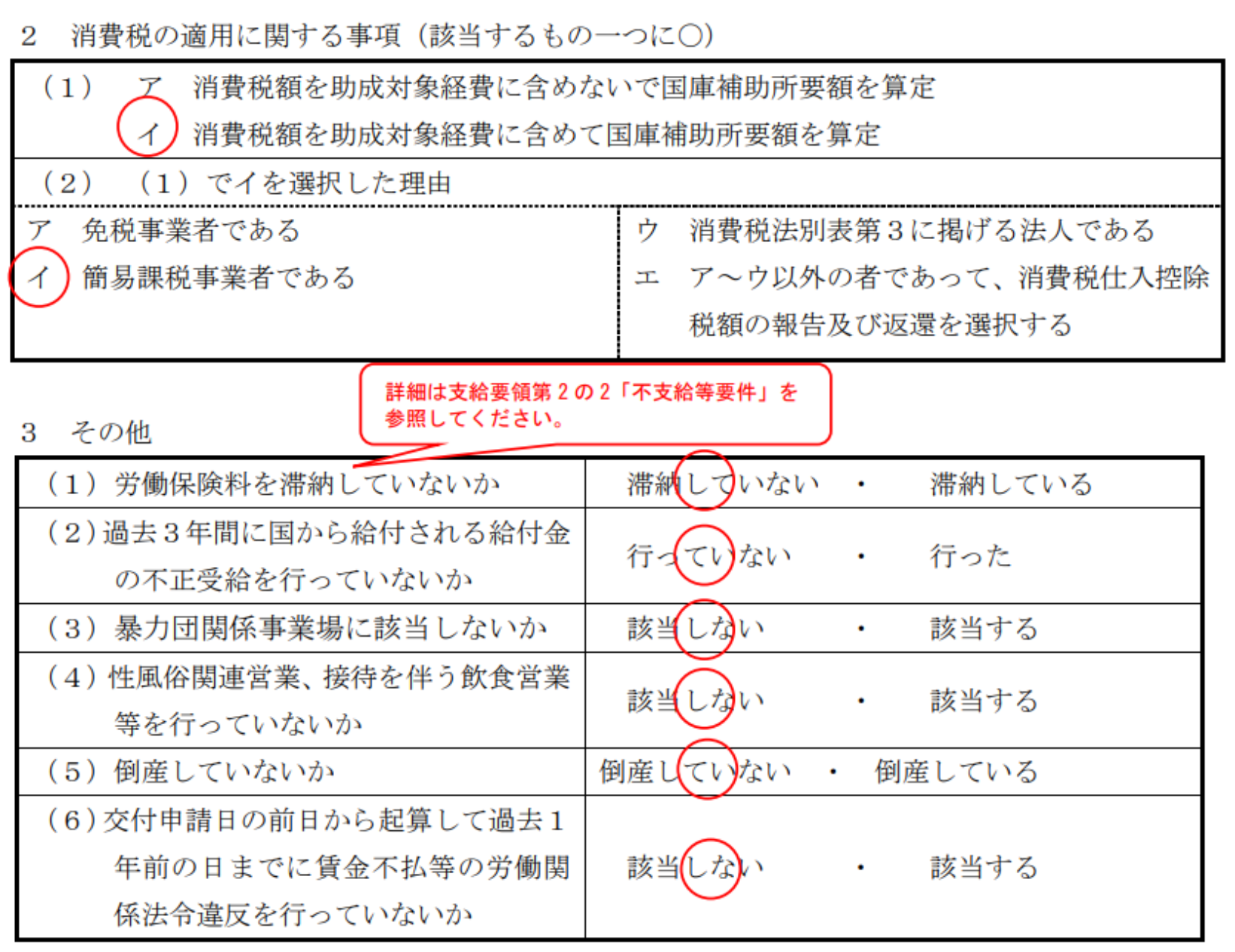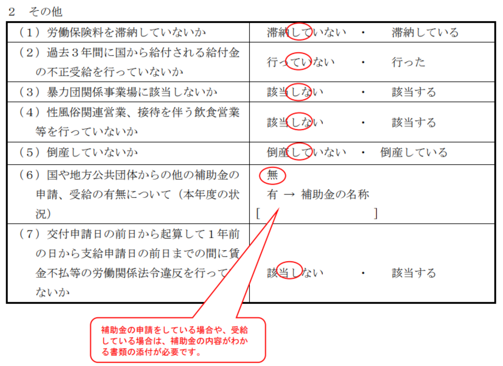 3の「その他」も1と同様に、助成金の対象企業かどうかを確かめるもので、滞納や不正受給などがないことをチェックします。滞納、不正受給などがあれば、本助成金を申請することはできません。