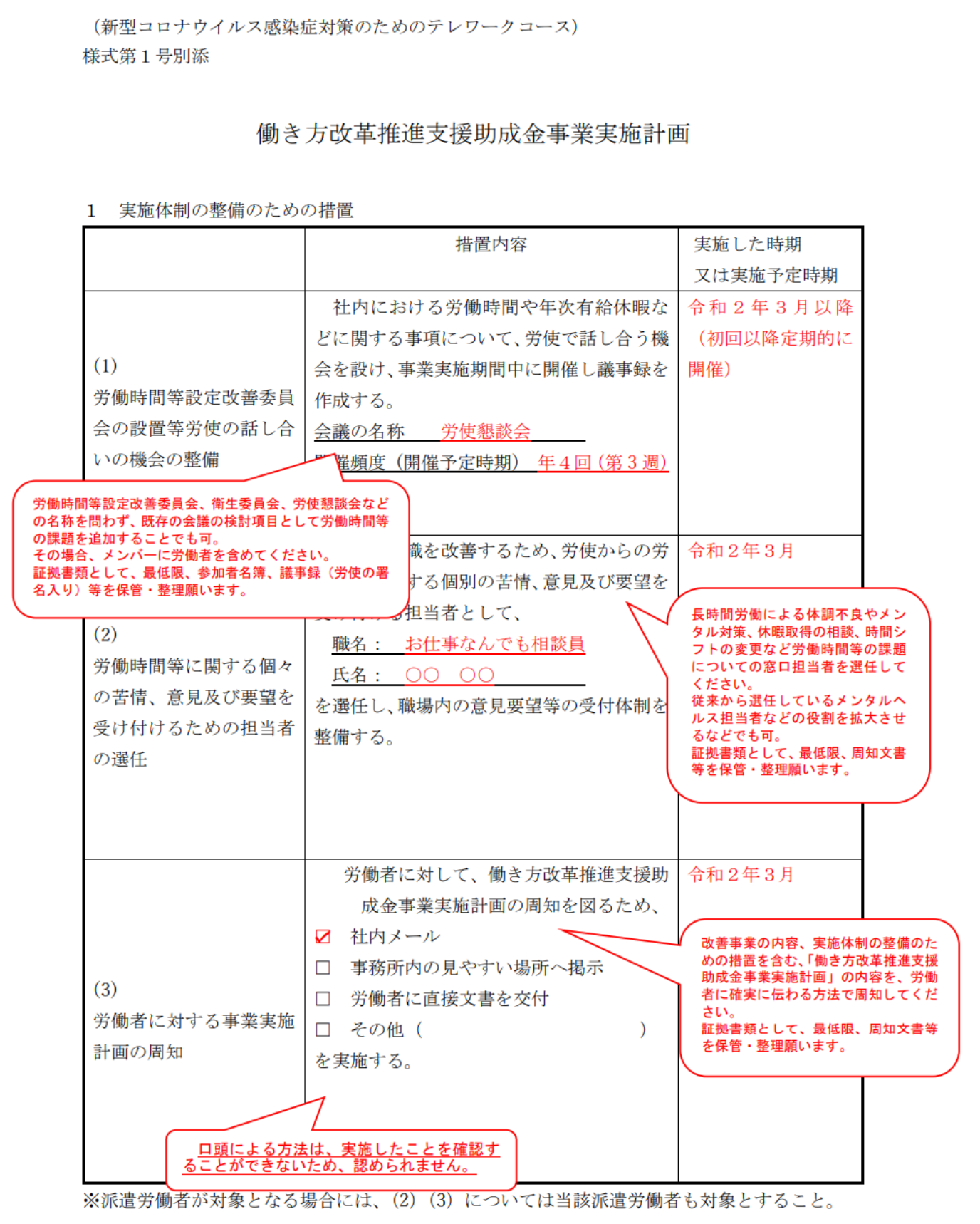 1枚目から見てみましょう。この書類にある通り、テレワーク導入にあたり、「会議体」と「相談窓口」と「周知方法」をどうするか決めます。「会議体」や「相談窓口」は、新設しなくても、他の目的で行っているものに、今回の役割をつけ加えてもよいでしょう。「周知方法」は、社内メール通知など、いずれかを選択します。1枚目はこれだけなので、方針さえ決定していれば、すぐに書き終わります。