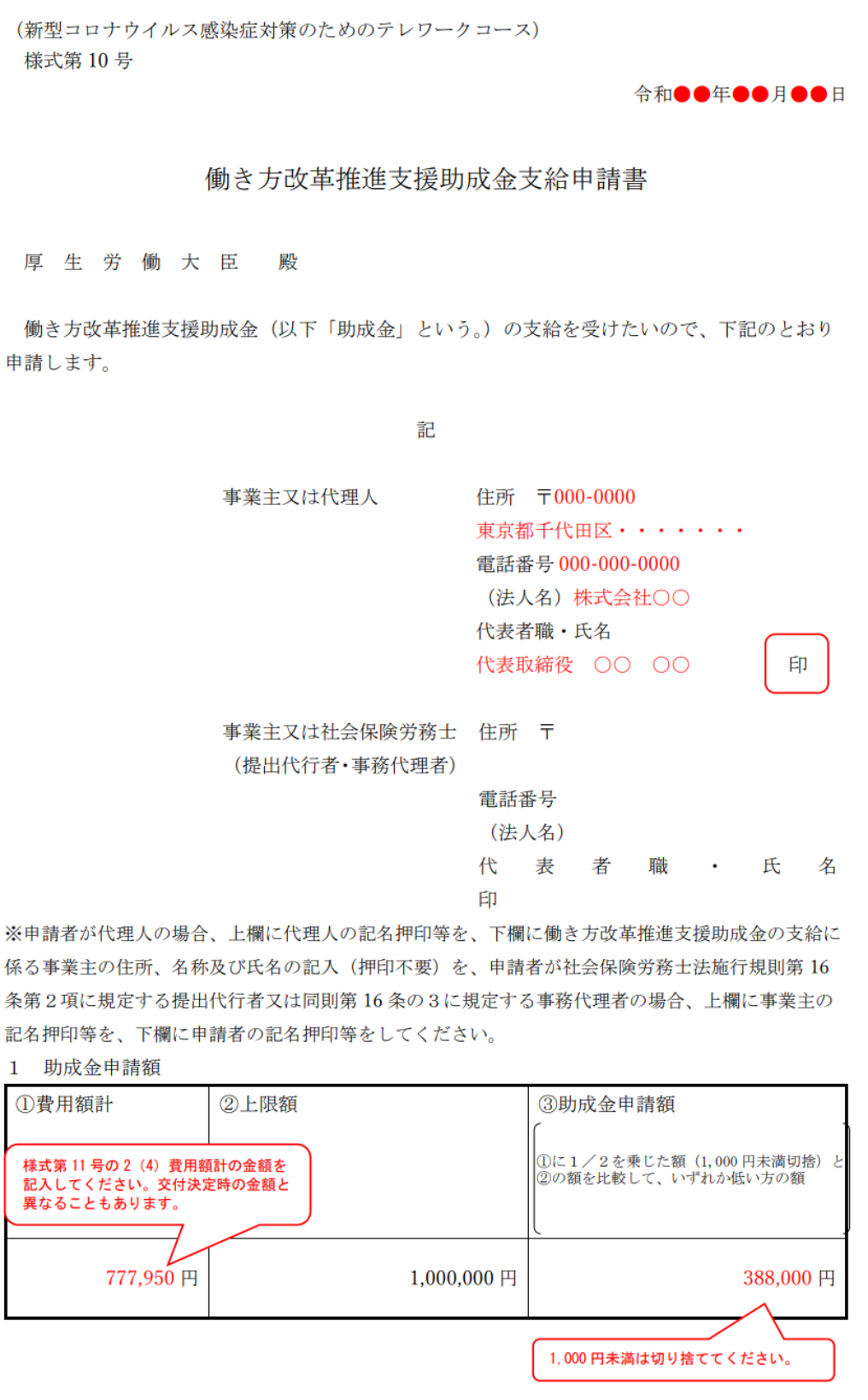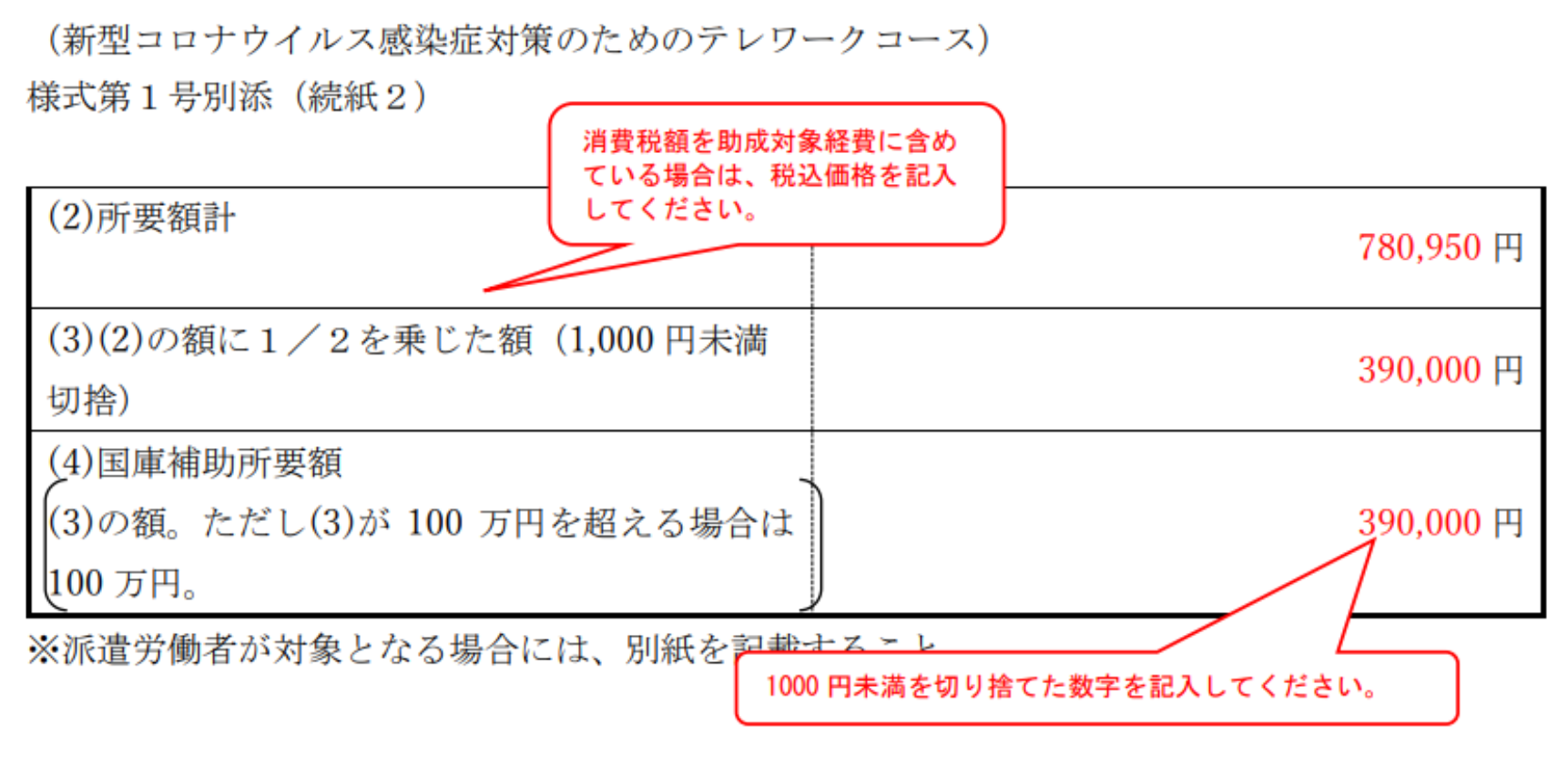 全てを書き終えたら、最後に合計額を(2)に書きます。そのうちの50%が助成額となるので、0.5をかけて1000円未満を切り捨てた金額を(3)に書きます。