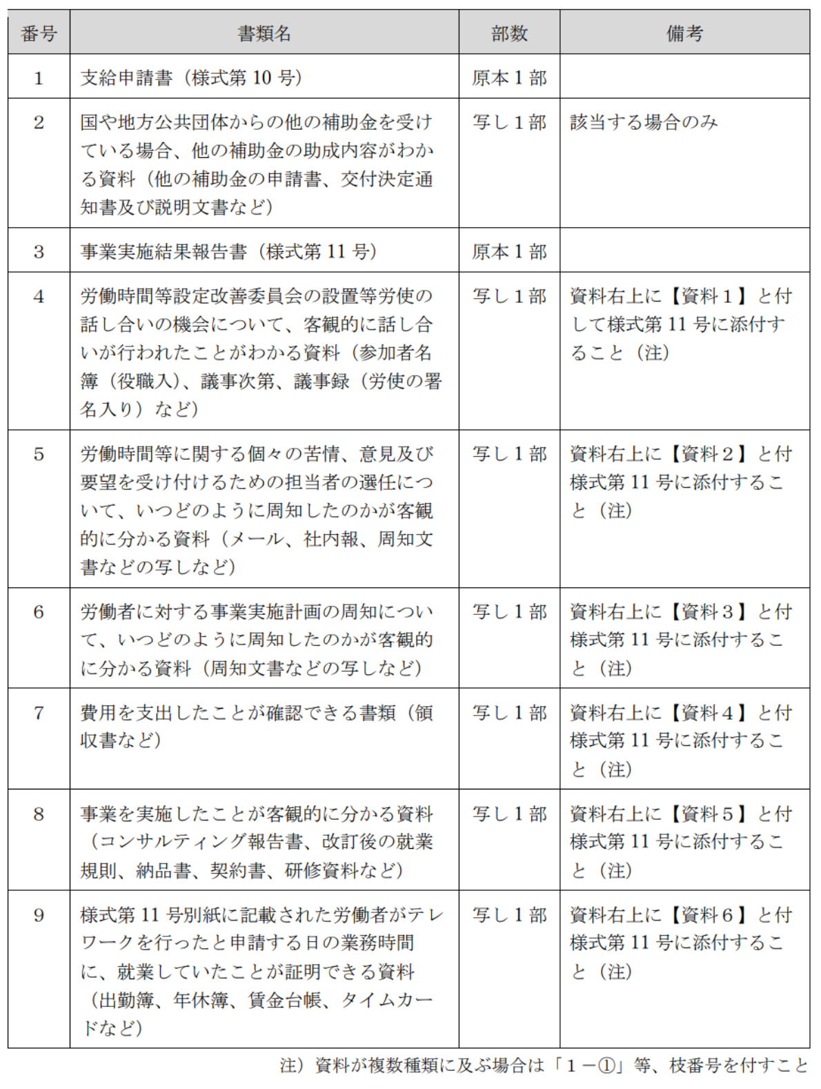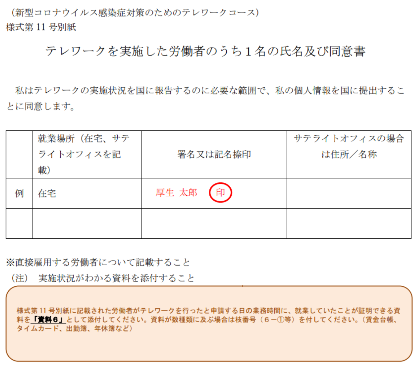 最後の「テレワークを実施した労働者のうち1名の氏名及び同意書」は、テレワーク実施者のうち、誰かひとりに署名してもらいます。直接雇用の社員であれば誰でもOKです。添付資料として、署名を行った人がテレワークを実施したと分かる証拠資料(出勤簿やタイムカードなど)が必要なので、その提出が容易な人を選ぶとスムーズです。