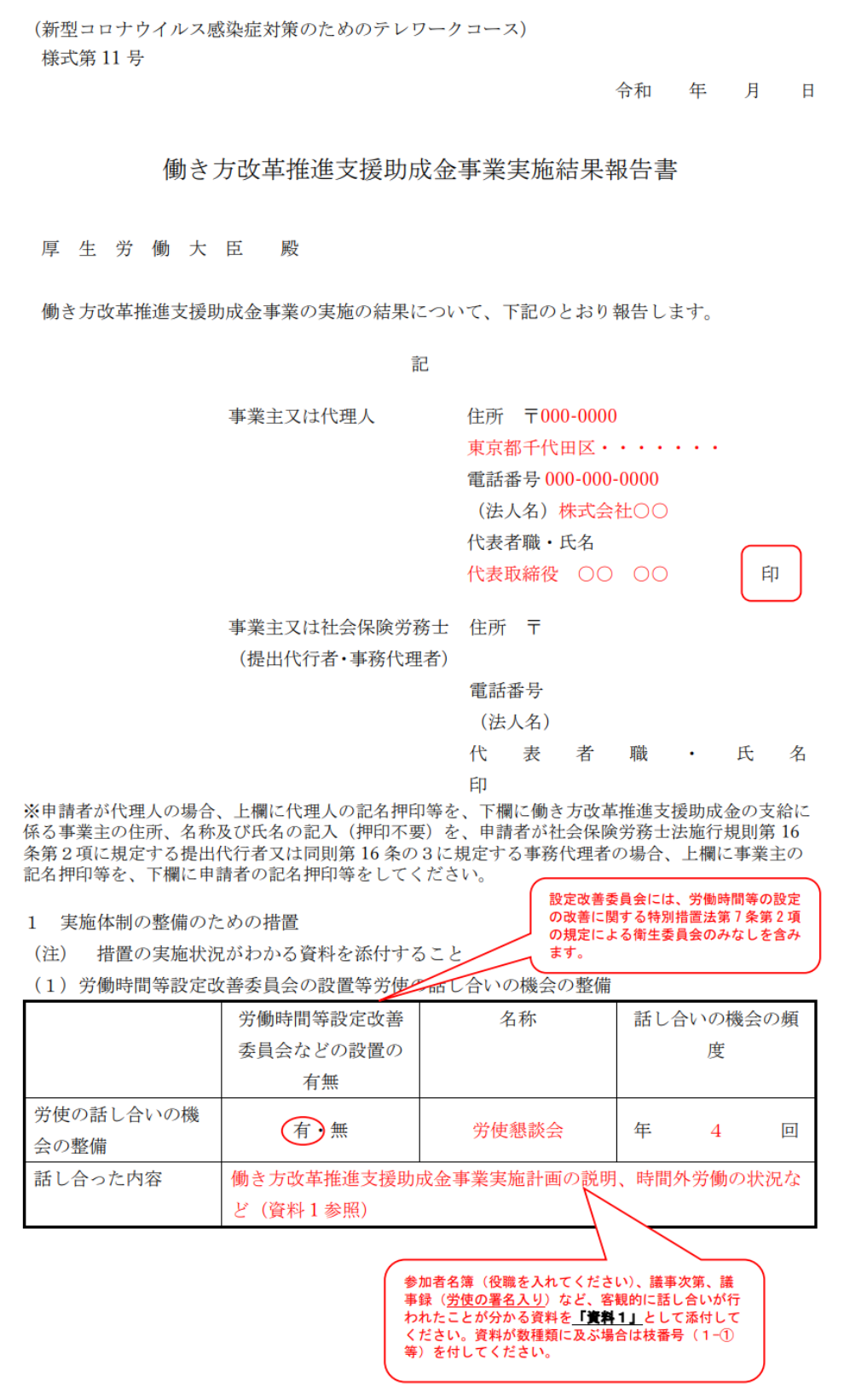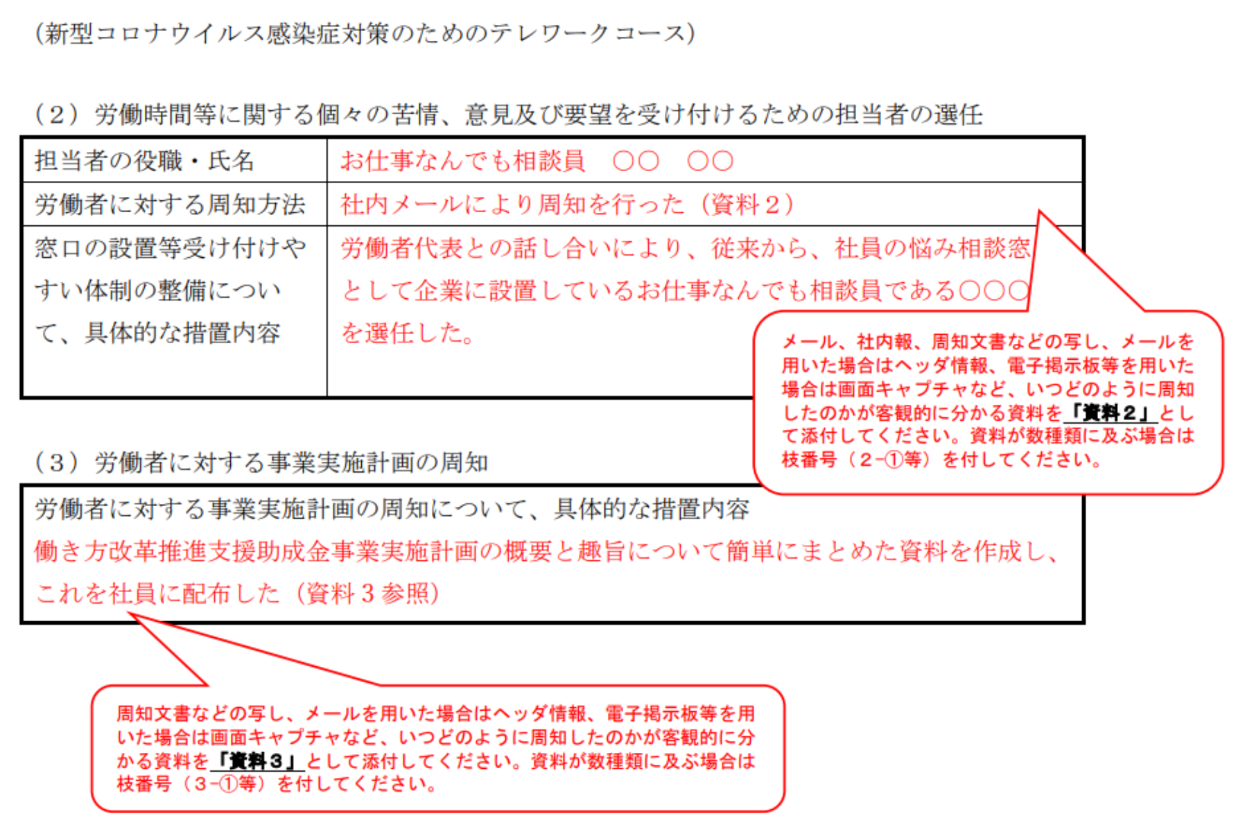 まず、1の「実施体制の整備のための措置」には、交付申請時に記載した「会議体」や「相談窓口」「周知」の実績について書きます。記載例にある通り、「○○という会議で、△△について話し合った」。「相談窓口は、○○とした」。「周知は△△で実施した」など、1~2行程度で端的にまとめて書けばOK。それぞれ、証拠となる添付資料が必要なので、保存しておかねばなりません。