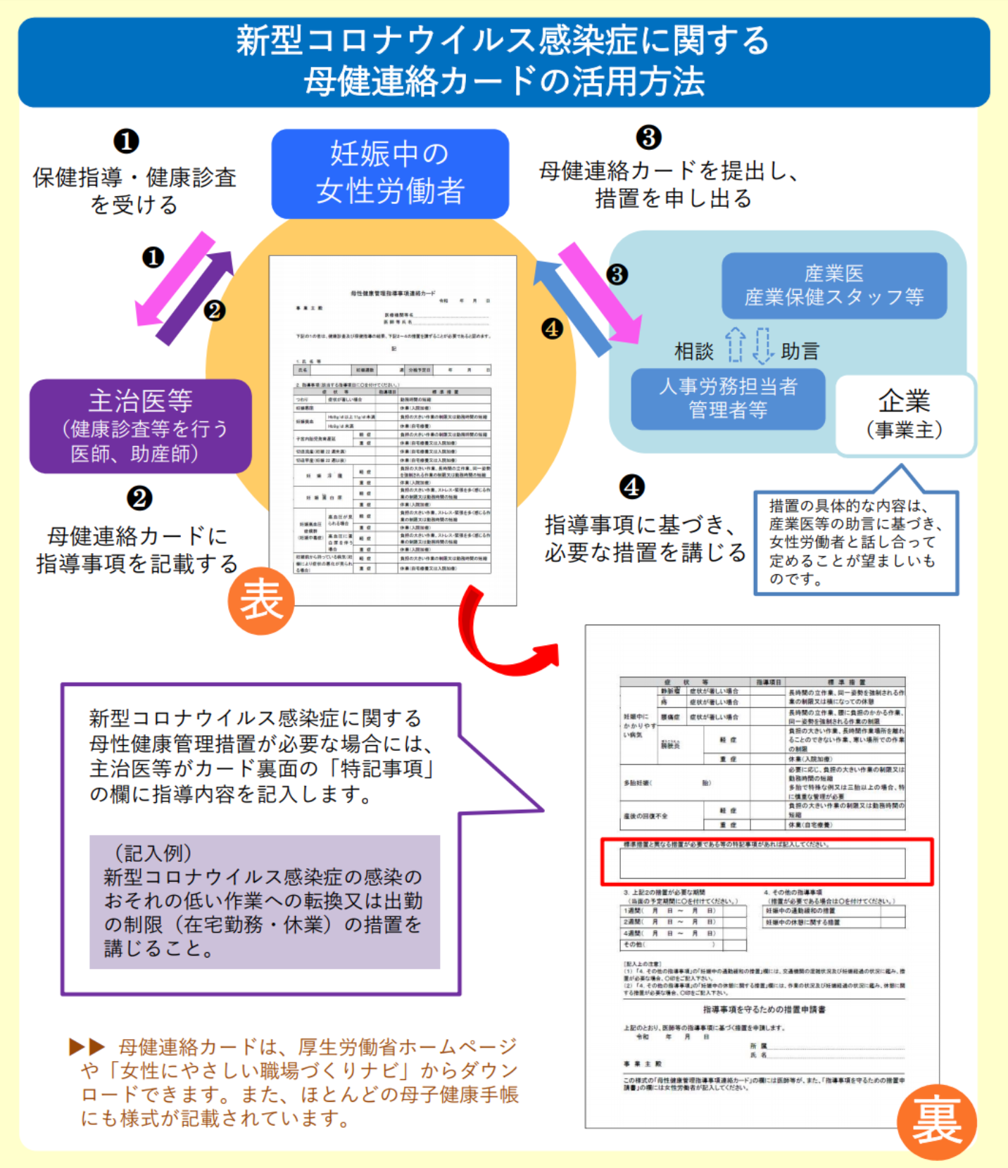 医師・助産師がカードに必要事項を書き、妊娠中の女性に渡します。それをもとに、妊娠中の女性は、上司に状況を説明するという流れです。必ずしも使わなければならないものではありませんが、これを活用すればスムーズにコミュニケーションがとれるでしょう。